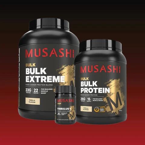 MUSASHI BULK EXTREME is a scientifically formulated nutritional supplement for hard gainers and growing adolescents looking to pack on serious mass. This powerhouse formula packs 376 calories, including 33g of high quality protein and 38g of glycogen-replenishing carbohydrates, as well as medium chain triglycerides in a great tasting protein shake.