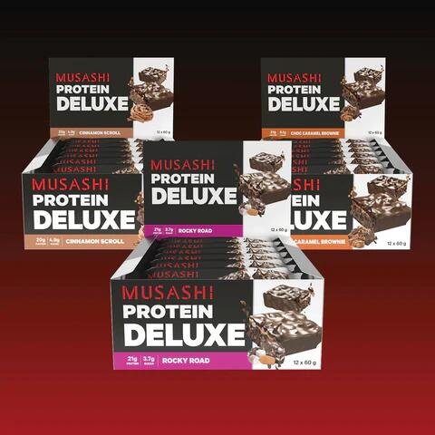 Musashi Deluxe Protein Bar Value Bundle Pack Chocolate Caramel Brownie / Cinnamon Scroll / Chocolate Caramel Brownie