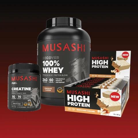MUSASHI PROTEIN + ENERGY BAR has been scientifically formulated with a 1:1 protein and carb blend and 1000mg of creatine monohydrate.