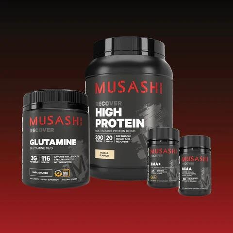 Musashi Glutamine: A conditionally essential amino acid that can aid muscle growth and help support healthy body stress recovery.
