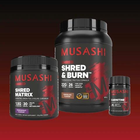 The Musashi Ultimate Shred Bundle Pack combines three effective products to help support fat metabolism, lean muscle growth and energy levels. The pack includes: Musashi Shred & Burn Powder: An optimised protein powder providing you with a powerful blend of active ingredients designed to support your lean muscle goals. Musashi Carnitine Capsules: Carnitine is an antioxidant and helps reduce free radicals formed in the body. It also helps to support energy production and assists post exercise recovery. Musashi Shred Matrix: A unique formulation that contains a blend of carnitine, choline, inositol and green tea extract. Carnitine, choline, chromium & riboflavin in the formula assist the metabolism of carbohydrates & sugar. Riboflavin helps convert food into energy. The Musashi Ultimate Shred Bundle Pack includes: Musashi Shred & Burn Powder Musashi Carnitine Capsules Musashi Shred Matrix “ALWAYS READ THE LABEL AND FOLLOW THE DIRECTIONS FOR USE”