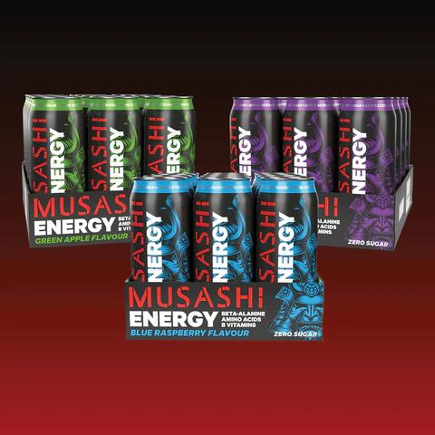 Musashi Energy is a zero-sugar flavour sensation with a synergistic blend of amino acids and key nutrients. An amplified energy beverage scientifically formulated to contribute to a reduction in tiredness and fatigue and support normal energy metabolism.