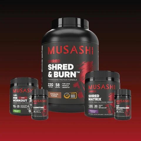 The Super Shred Bundle is an upgraded combination of shredding products to support your summer body goals. This bundle includes: MUSASHI PRE WORKOUT SHRED is a unique formulation that combines functional ingredients that contribute to support your sports nutrition needs, acting as a pre-workout catalyst to take your game or workout to the next level. MUSASHI SHRED & BURN PROTEIN POWDER (2KG) is an optimised protein powder providing a powerful blend of active ingredients designed to support lean muscle goals. MUSASHI SHRED MATRIX is a unique formulation that assist the metabolism of carbohydrates & sugar. MUSASHI FAT METABOLISER with CARNITINE has been developed to assist the metabolism of stored fat when used in conjunction with a healthy diet and active lifestyle. MUSASHI CARNITINE is an amino acid that plays a role in fat metabolism.