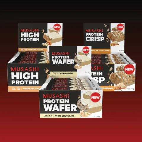 The Musashi White Choc Bundle Pack combines three of our best-selling protein bars in three delicious white choc flavours. This bundle includes: MUSASHI HIGH PROTEIN bar packs 44g of protein with less than 5g of carbs in a convenient, delicious chocolate coated bar with tasty, flavoured centre. MUSASHI PROTEIN WAFER bars are 4 layers of crisp wafer layered with a smooth, next-generation WPC protein cream filling & enrobed with high protein chocolate. MUSASHI PROTEIN CRISP is the next evolution in the protein bar taste and sensation experience.