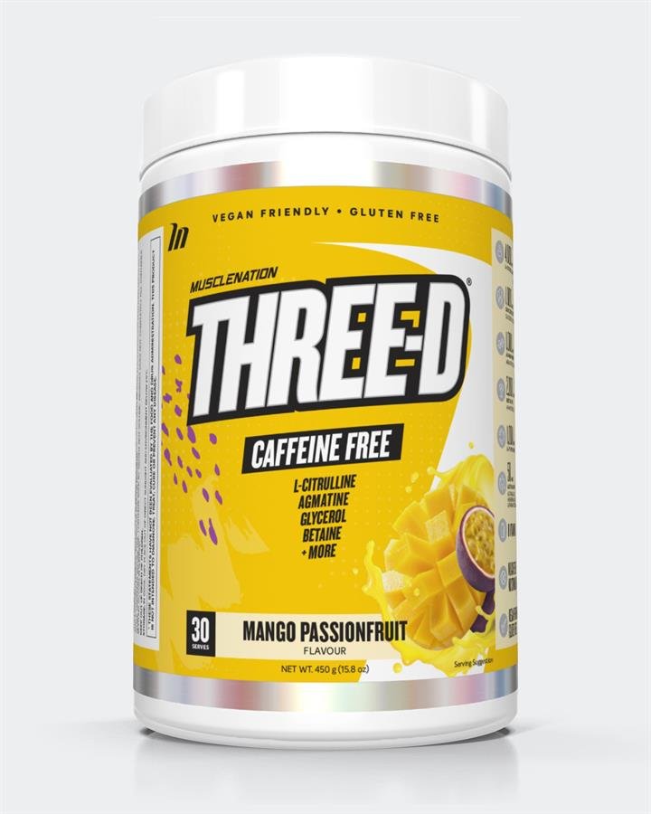 Muscle Nation THREE D Pre Workout Pump Caffeine Free – Mango Passionfruit – 30 serves